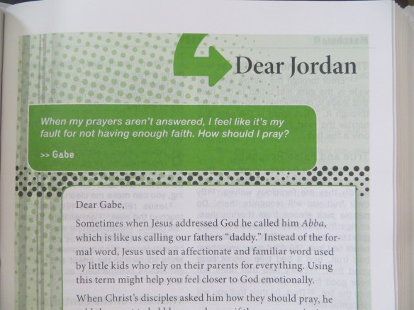 This bible opens with the Apostles’ Creed and offers nice introductions to all books. In summary, it’s a non-gender specific bible that both teen boys and teen girls would appreciate. That said, my 15-year old daughter who had been searching for a new bible decided that the NIV Teen Bible wasn’t for her. She opted to get a young women’s bible that was brighter, more “girly”, and contained less mature content. My 17 1/2 year old son on the other hand wouldn’t have had a problem with the content contained in The NIV Teen Bible.