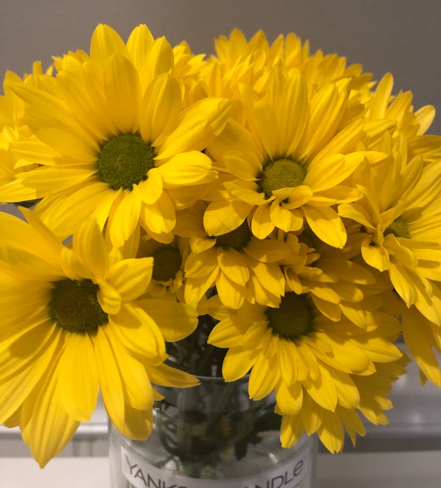 When picking up flowers to have on various tables at my twins graduation party, I decided to get a variety of a few different blooms. Their party was three weeks ago and I JUST had to retire these happy, pretty daisies this morning! They were the least expensive yet brought joy for much longer than any other flower!