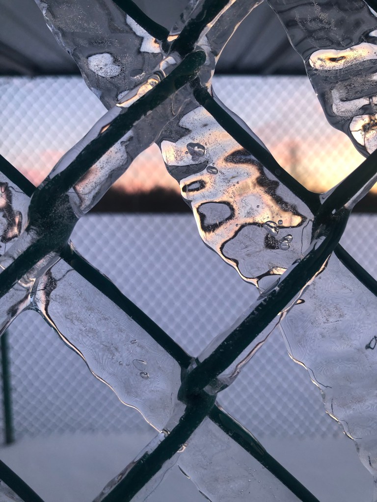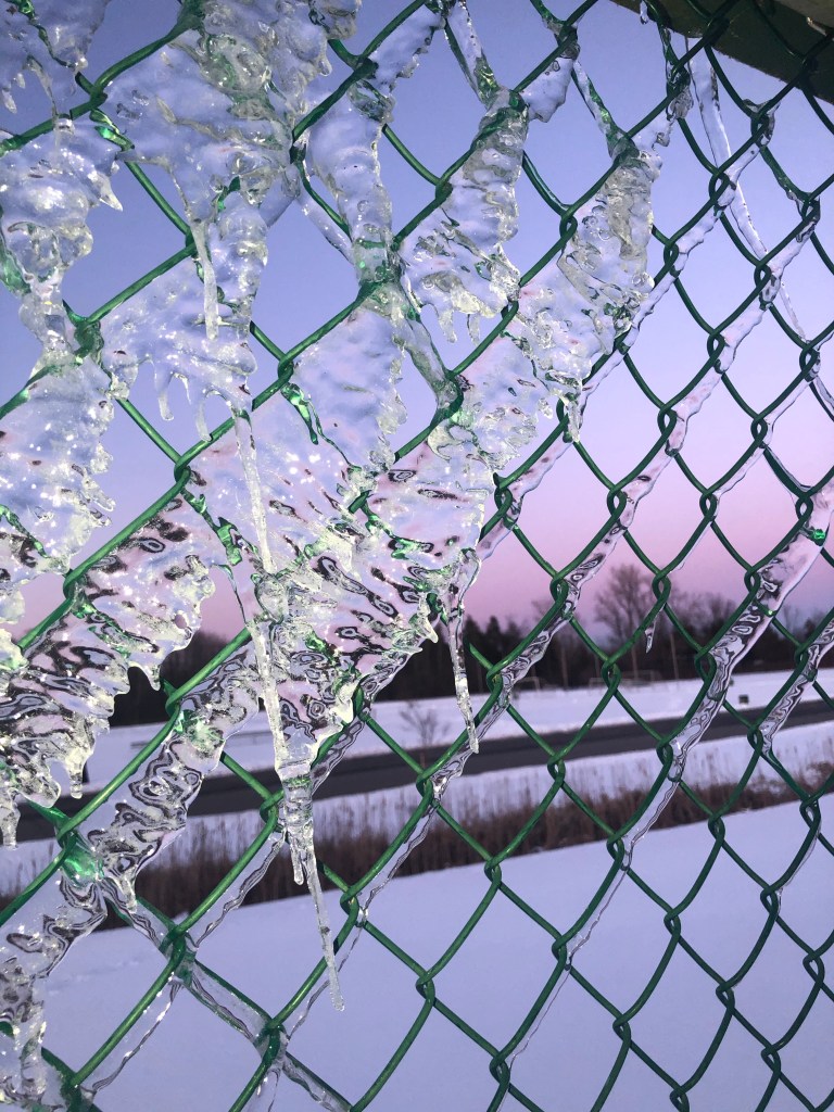I lasted about 15 minutes before starting back toward my car. On the way, I looked over at the baseball dugout, mesmerized by the rock solid ice reflecting the sunset through the wire.
